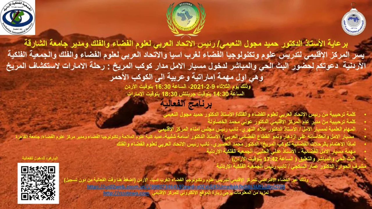يسر المركز الإقليمي لتدريس علوم وتكنولوجيا الفضاء لغرب اسيا والاتحاد العربي لعلوم الفضاء والفلك والجمعية الفلكية الأردنية دعوتكم لحضور البث الحي والمباشر لدخول مسبار الامل مدار كوكب المريخ : رحلة الامارات لاستكشاف المريخ وهي اول مهمة إماراتية وعربية الى الكوكب الأحمر