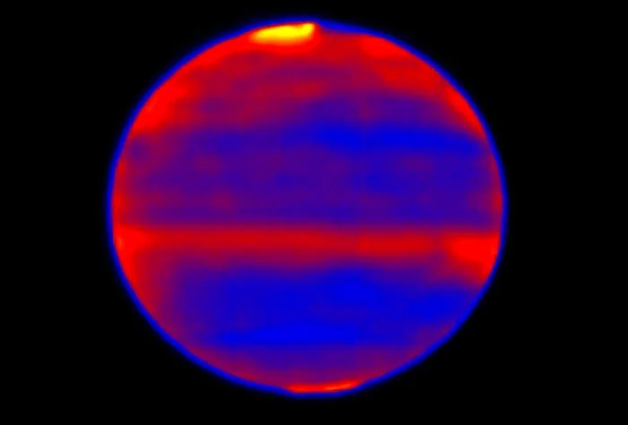 حيث تشير مناطق الغلاف الجوي ذات اللون الاصفر والأحمر إلى المناطق الأكثر سخونة ، وهذا يسلط الضوء على التسخين الشفقي في أقطاب المشتري حيث تترسب الطاقة من الريح الشمسية والغلاف المغناطيسي.