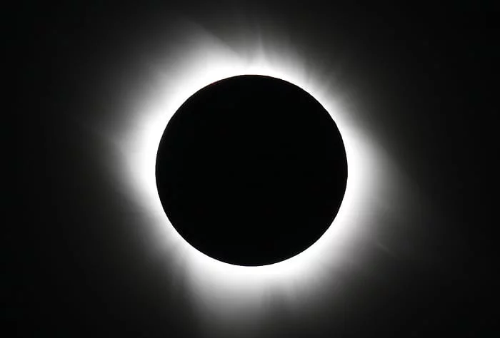 واخيرا يحدث كسوف الشمس الكلي عندما يتم رؤية الغلاف الجوي للشمس المعروف باسم ” الكورونا أو الهالة ” ، عندها سوف تتكيف عين الراصد مع مستوى الضوء المنخفض الجديد ، ومع تكيف العين فإن الهالة الشمسية تصبح مرئية ، هذه الهالة تتكون من غاز في غاية السخونة ومشحون كهربائيا – البلازما – تبلغ حرارتها 2 مليون درجة مئوية وتمتد ملايين الكيلومترات إلى الخارج نحو الفضاء.