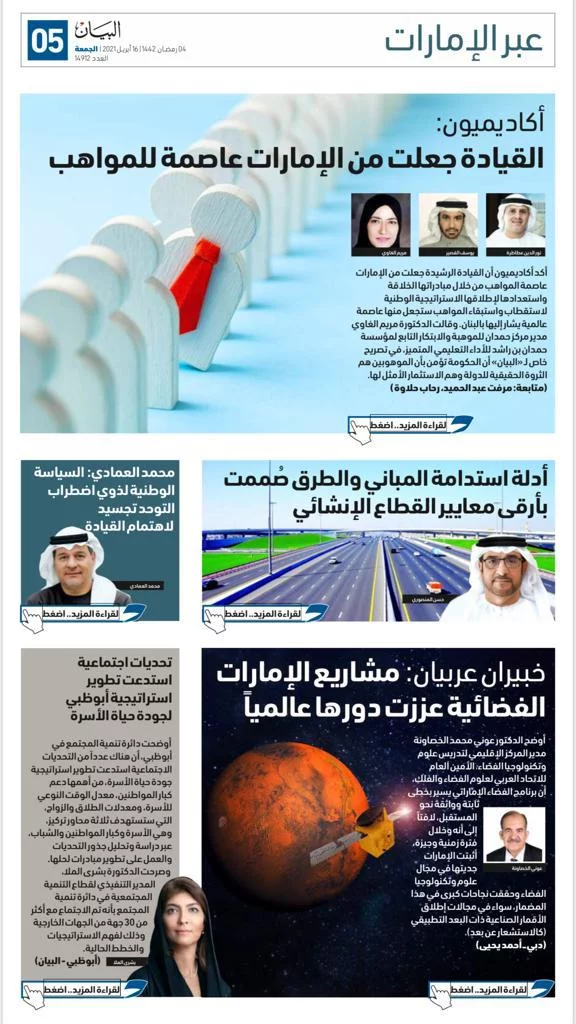 أو في مجال استكشاف الفضاء لغايات علمية مثل مسبار الأمل لاستكشاف كوكب المريخ، أو في مجال الارتياد البشري للفضاء، بدءاً برائد الفضاء الإماراتي هزاع المنصوري وزميله سلطان النيادي، وانتهاء بنورا المطروشي التي ستكون أول رائدة فضاء عربية وزميلها محمد الملا.