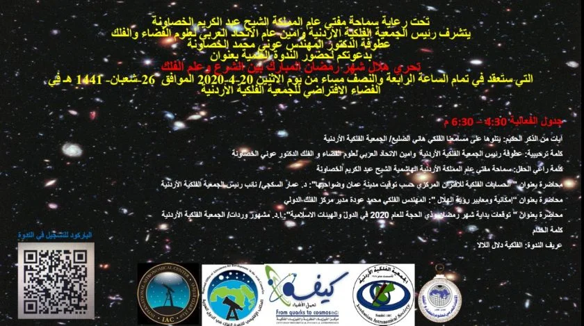 التي ستعقد في تمام الساعة الرابعة والنصف مساء من يوم الاثنين 20-4-2020 الموافق 26-شعبان- 1441 هـ في الفضاء الافتراضي للجمعية الفلكية الأردنية