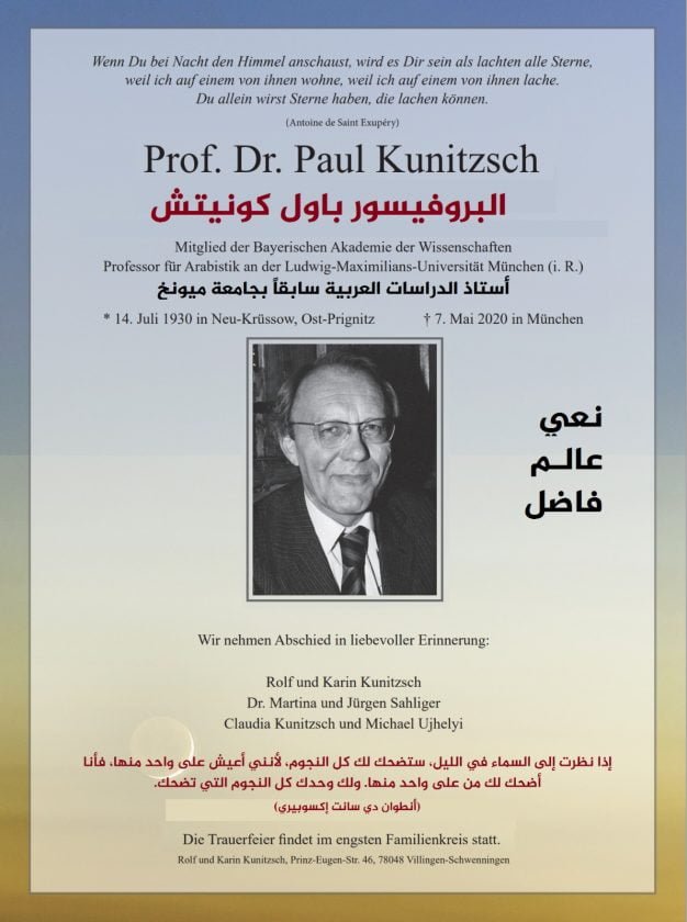 لقد فقدت البشرية أعظم علماء هذا الفن في القرن العشرين، فهو صاحب أكثر من 300 ورقة بحثية و 15 كتابا بلغات أربع حية هي العربية والإنجليزية والفرنسية والألمانية. فقد كان كرس حياته لدراسة انتقال علم الفلك من اليونان إلى العرب ومن العرب إلى أوروبا. The Heritage of Prof. Paul Kunitzsch ((July 14. 1930-May 7, 2020)