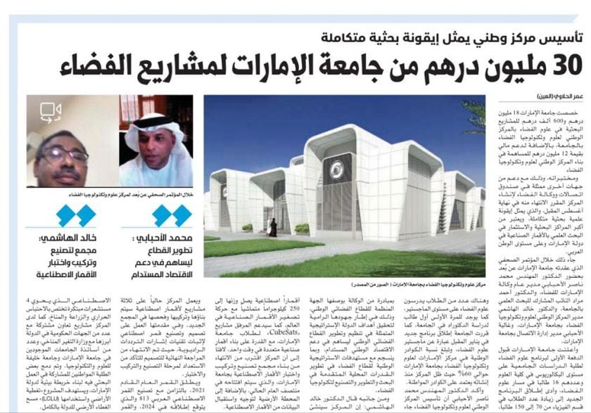 المصدر: العين – داوود محمد \ التاريخ: 20 أبريل 2020 ناقش مجلس أمناء المركز الوطني لعلوم تكنولوجيا الفضاء في جامعة الإمارات، مشروع القمر الاصطناعي العربي 813، للأغراض المدنية والاستخدامات المتعددة لخدمة الوطن العربي ودول المنطقة وإعادة تشكيل المجلس وانضمام 3 أعضاء جدد وهم: الدكتور غالب الحضرمي البريكي، نائب مدير الجامعة، المهندس علي الهاشمي مدير عام الياه