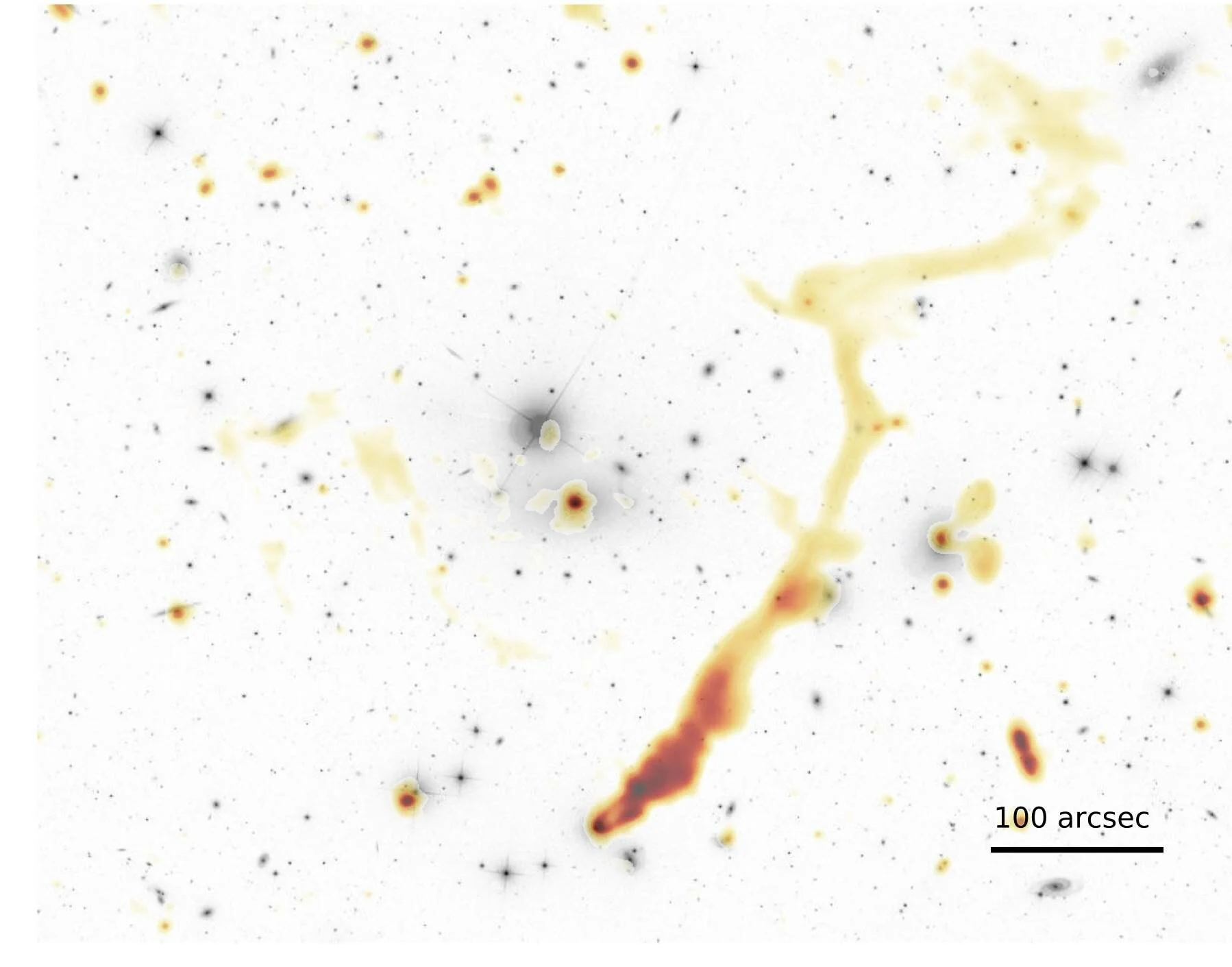 Above: Galaxy cluster Abell 1314 as imaged by LOFAR. The grey indicates visible light, while the orange hues show the ‘hidden’ radio emissions, completely changing the picture.