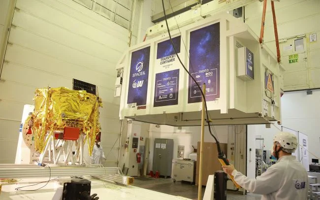 A uniquely designed temperature-controlled shipping container is placed over the first Israeli lunar spacecraft, the Beresheet. The craft flew inside a cargo plane to Florida for the upcoming historic launch to the moon.