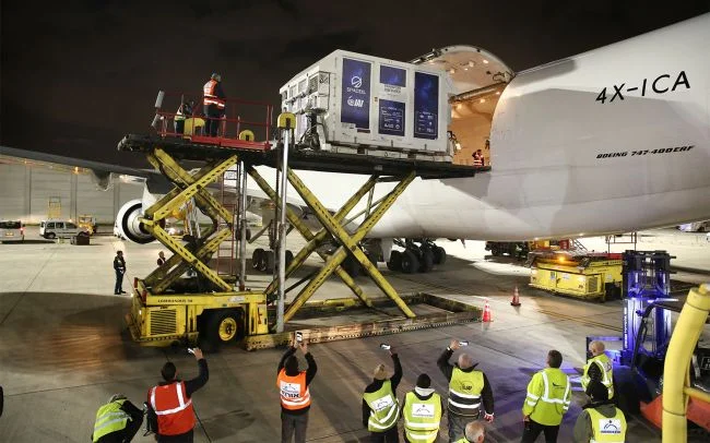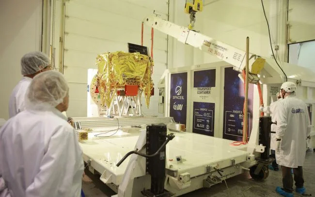 Before traveling to Ben Gurion Airport in Israel, SpaceIl’s spacecraft, the Beresheet Lander, is loaded into a temperature-controlled shipping container. Then the craft is loaded onto a cargo plane bound for Florida.