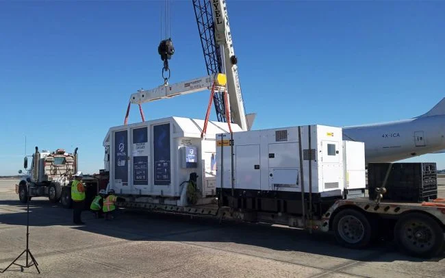 On the tarmac at Ben Gurion airport, the shipping container holding SpaceIL’s Beresheet Lander awaits being loaded into the readied cargo plane.