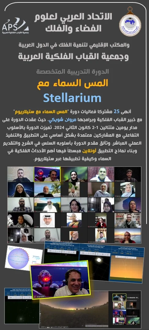 الاتحاد العربي لعلوم الفضاء والفلك يفتتح العام الجديد ٢٠٢٤ بعقد الدورة الاولى بالتعاون مع جمعية القباب الفلكية تحت عنوان ( المس السماء )